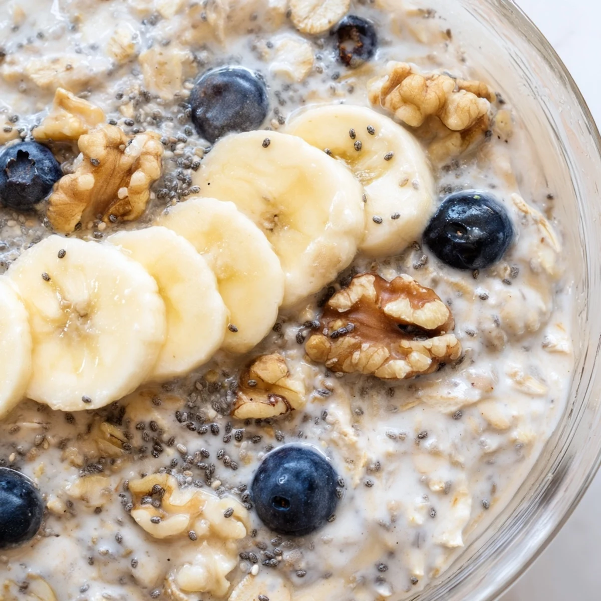 These creamy overnight oats combine old-fashioned rolled oats with milk, Greek yogurt, and brown sugar for a naturally sweet breakfast. The vanilla adds warmth while the chia or flaxseeds provide extra nutrition. Simply mix everything together, refrigerate overnight, and top with fresh berries, banana, or chopped nuts in the morning.
