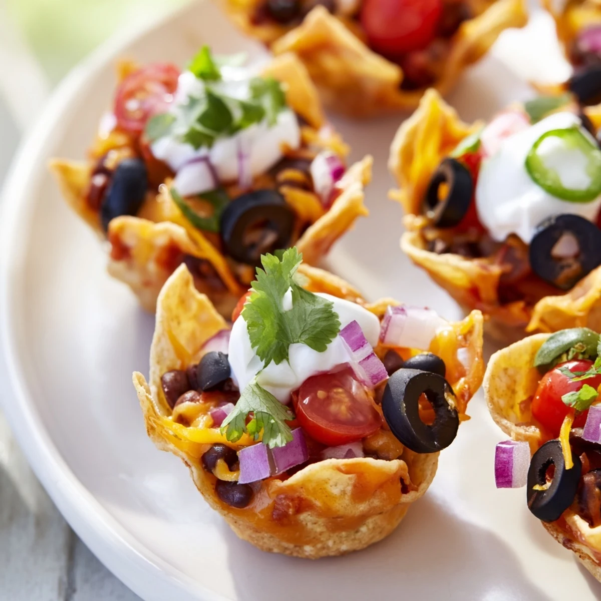Transform ordinary tortilla chips into bite-sized vessels of Tex-Mex goodness. These crunchy cups get filled with a blend of sharp cheddar and creamy Monterey Jack, then piled high with black beans, juicy cherry tomatoes, and briny olives. After a quick bake until the cheese turns bubbly and golden, each cup gets finished with cool sour cream and bright cilantro. The entire assembly takes just 25 minutes from start to finish, making them ideal for spontaneous game day hosting or casual entertaining.