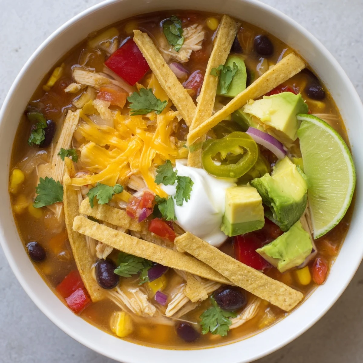 This hearty Mexican-inspired soup brings together tender shredded chicken, black beans, corn, and aromatic spices in a rich tomato-based broth. The star of the show is the homemade crispy tortilla strips that add perfect crunch to every spoonful. Ready in under an hour, this comforting bowl comes together with simple pantry staples and fresh garnishes like avocado, cilantro, and lime.