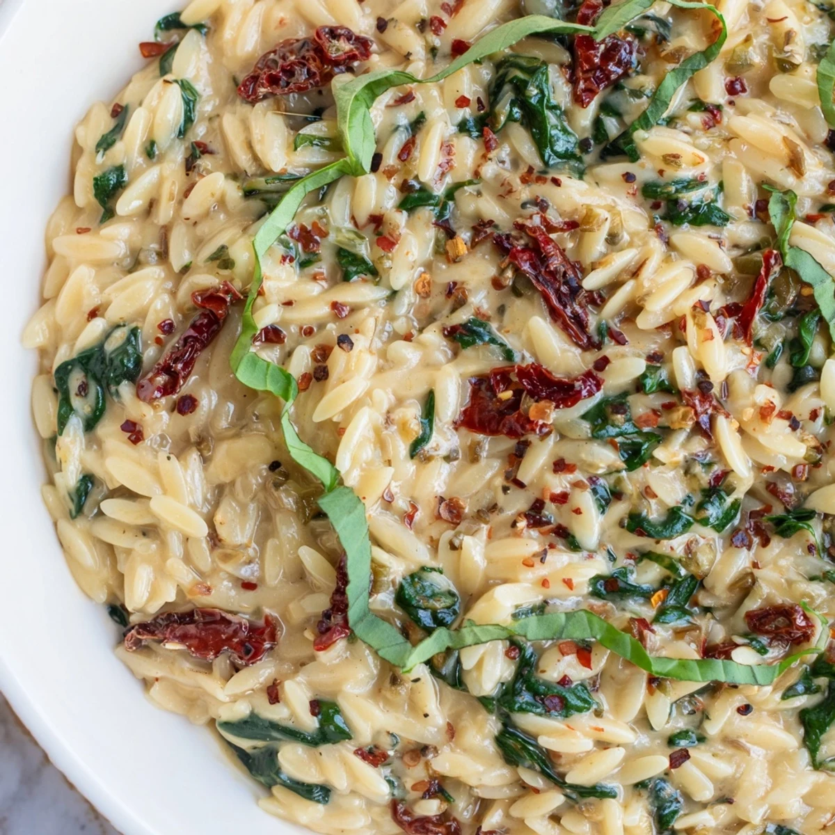 This satisfying one-pan dish combines tender orzo pasta with a luxurious creamy sauce infused with Tuscan flavors. Sun-dried tomatoes provide sweet intensity while fresh baby spinach adds vibrant color and nutrients. The heavy cream creates a velvety texture that coats every grain perfectly, and Parmesan adds salty depth.