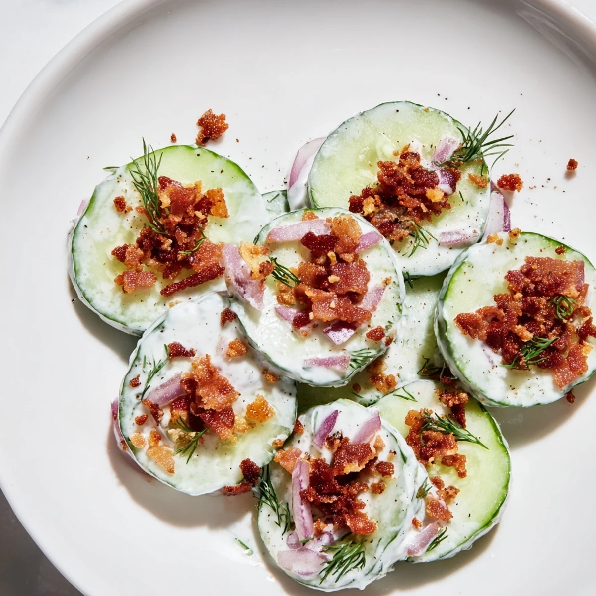 This crisp, refreshing salad combines thinly sliced cucumbers and red onion with smoky crumbled bacon for a satisfying crunch. The light tangy dressing whisks together Greek yogurt, apple cider vinegar, olive oil, and Dijon mustard, creating a perfect balance of creaminess and zest. Fresh dill adds aromatic brightness while keeping the preparation simple at just 15 minutes of prep time.