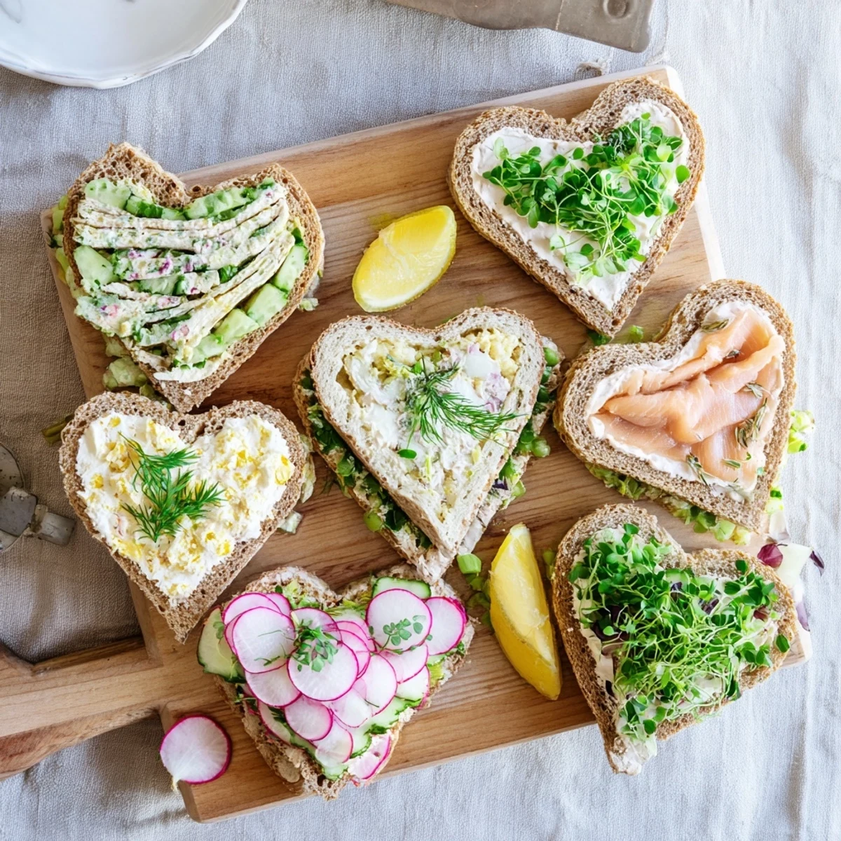 The preparation is straightforward: simply prepare the fillings, cut bread slices with a heart-shaped cookie cutter, and assemble with generous layers of each spread. The final presentation becomes a work of art when arranged on a large serving board and garnished with fresh radishes, microgreens, and edible flowers.