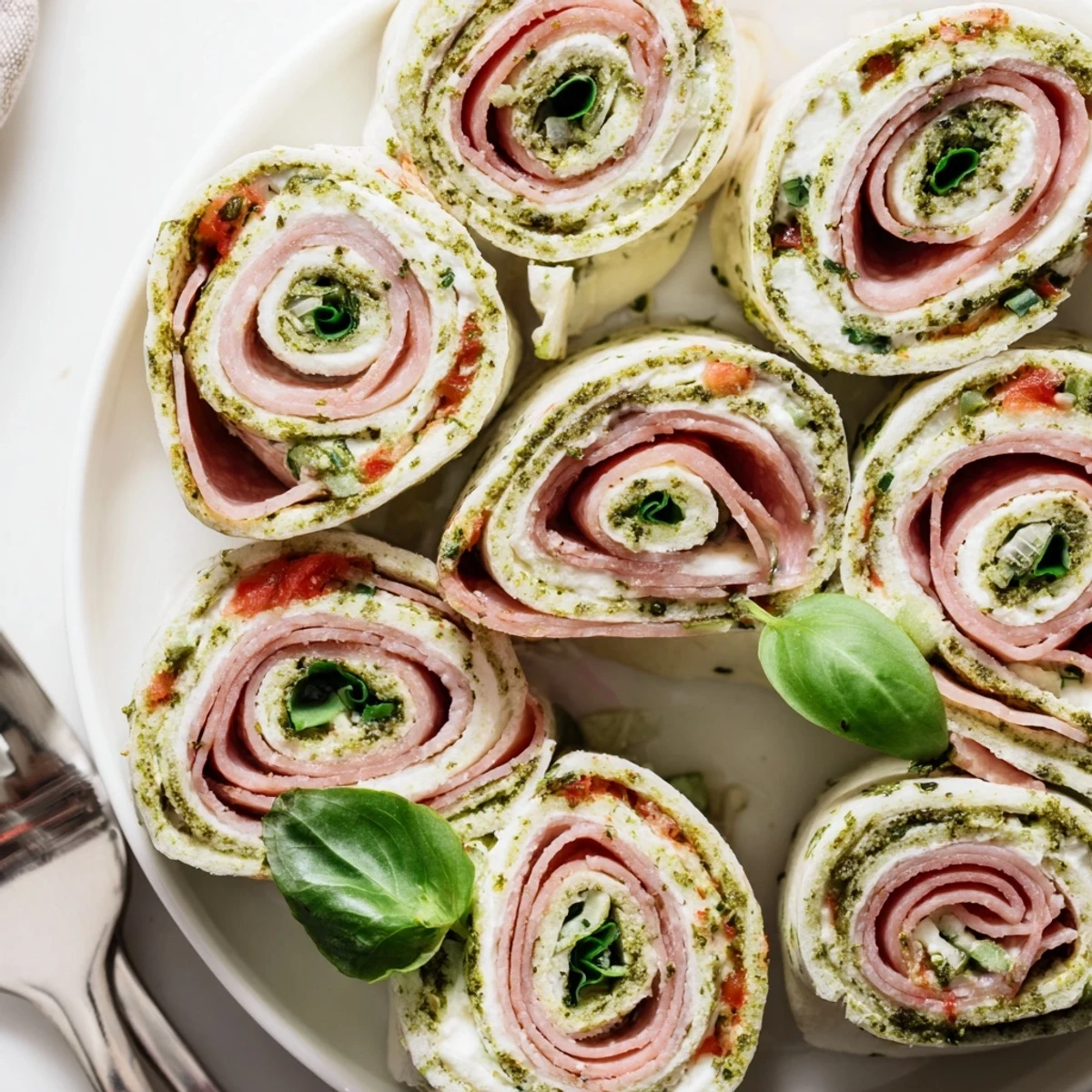 These Italian pinwheel sandwiches layer pesto-swirl cream cheese with Genoa salami, smoked ham and provolone, plus diced red pepper, julienned cucumber and baby spinach. Spread, stack, roll tortillas tightly, chill to firm, then slice into 24 pinwheels. Ready in about 20 minutes plus an optional 30-minute chill. Serve chilled or at room temperature; garnish with basil.