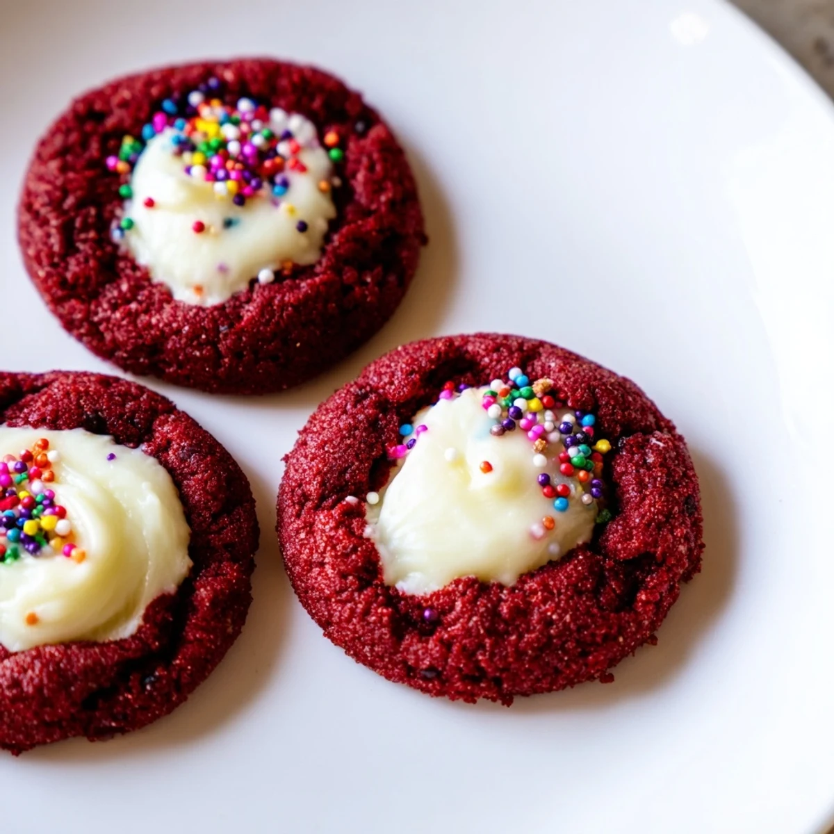 These cookies happened by accident one December afternoon when I had red velvet cake batter leftover and thumbprint cookies on my mind. That rich chocolate-vanilla flavor with the tang of cream cheese just clicked together in ways I hadn't expected. My kitchen smelled like chocolate and holiday spices while they baked, which was honestly reason enough to make them again. They've become my go-to whenever I want something that looks impressive but doesn't require three hours and a culinary degree.