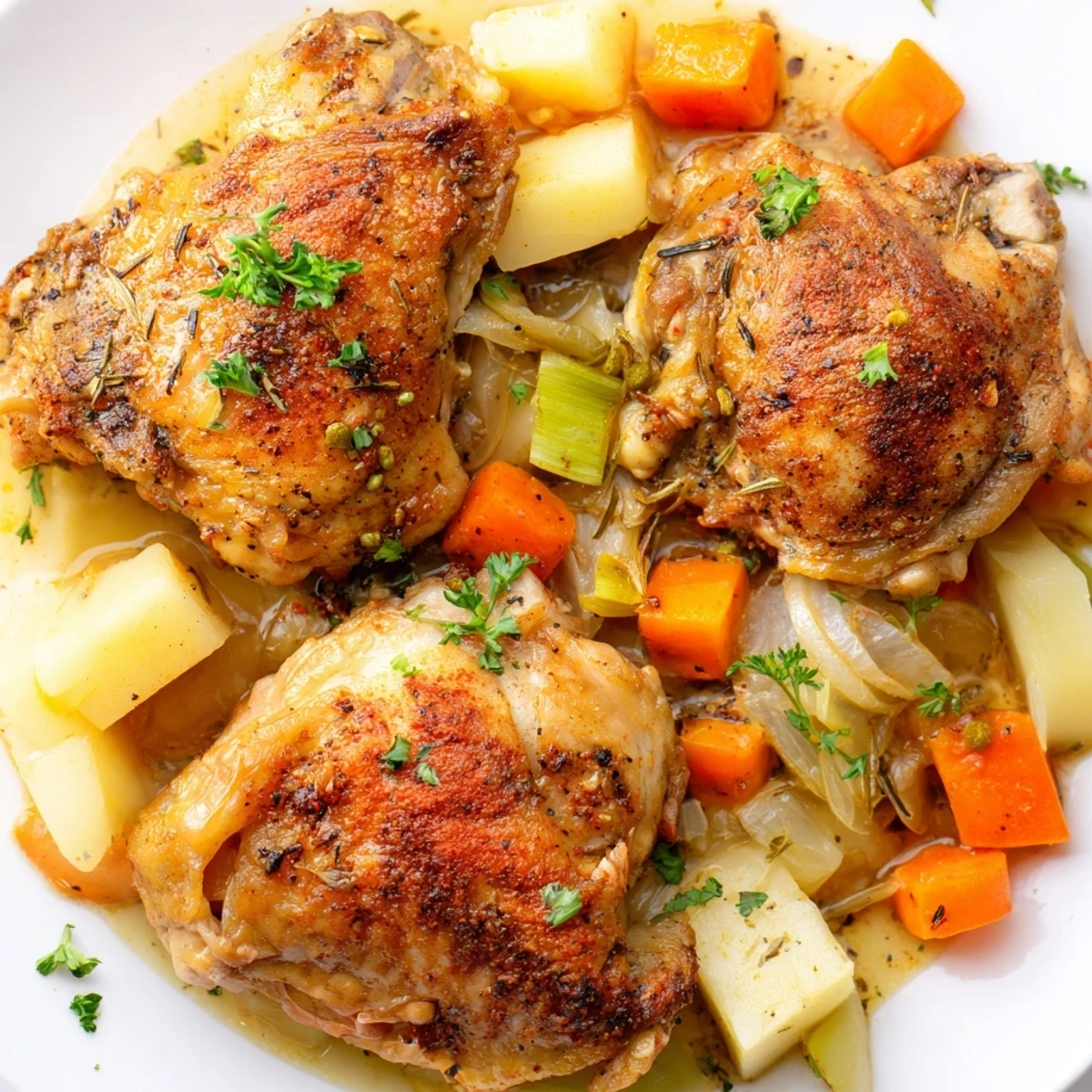 This comforting meal features bone-in chicken thighs slow-cooked with hearty vegetables including carrots, potatoes, onions, and celery. The herb-infused sauce combines thyme, rosemary, and paprika for deep flavor. Simply season the chicken, optionally brown it in a skillet, then layer everything in your slow cooker with chicken broth. Six hours later, you'll have tender, succulent meat and perfectly cooked vegetables. Garnish with fresh parsley and serve alongside crusty bread or over rice for a satisfying dinner that practically makes itself.