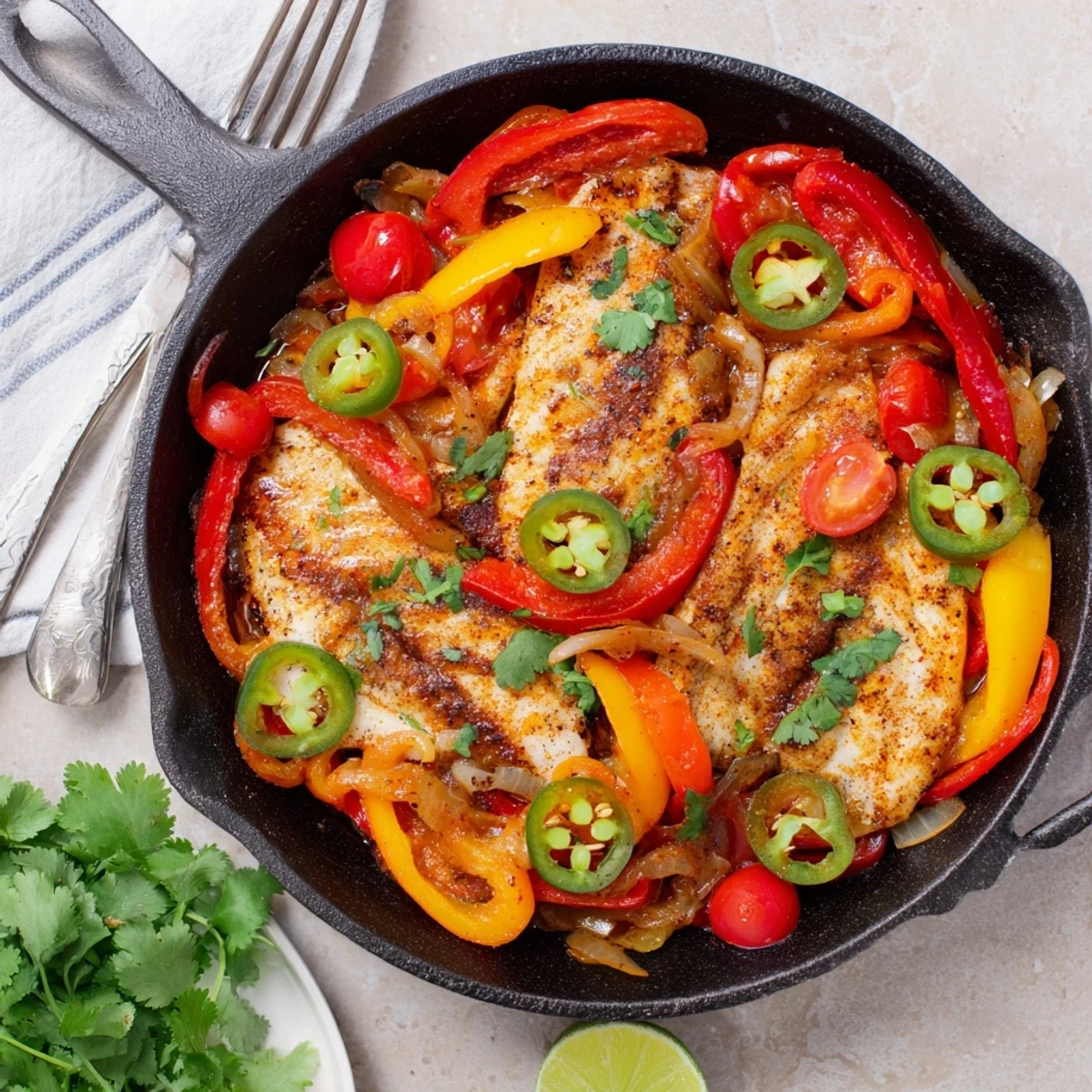 This colorful skillet combines tender tilapia with a medley of roasted red and yellow peppers, plus a kick of jalapeño. The fish simmers in a smoky, aromatic sauce made with garlic, onion, diced tomatoes, and warm spices like smoked paprika and cumin. A finish of fresh lime juice and cilantro brightens everything. Ready in under 40 minutes, this gluten-free and dairy-free main delivers restaurant-quality flavors with minimal effort.